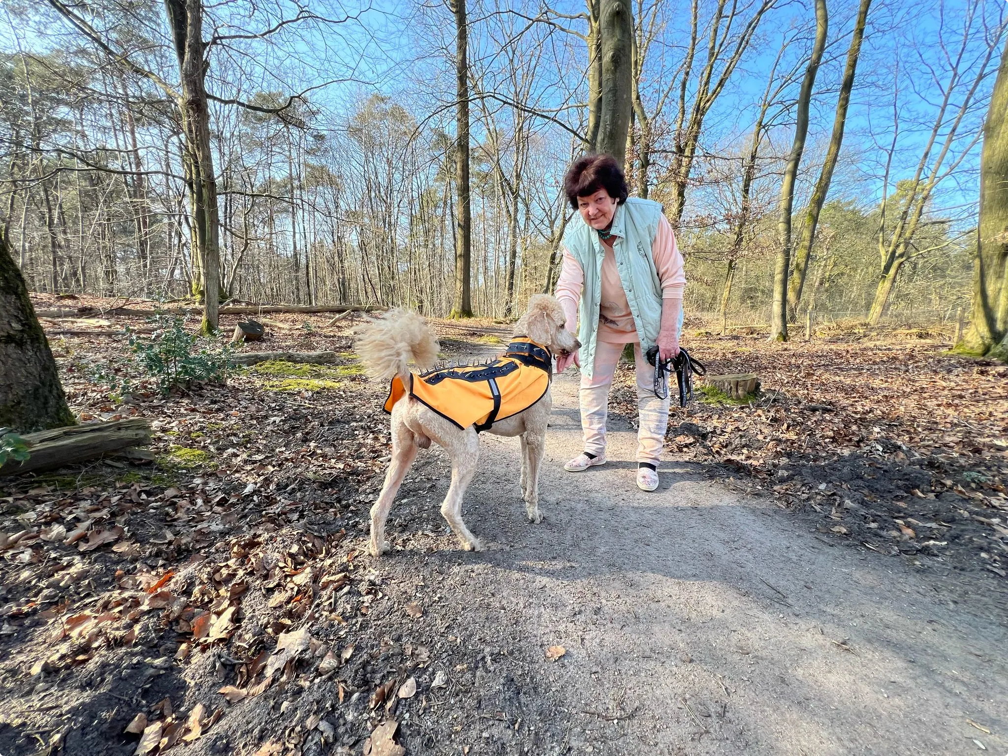 De angst voor de wolf heerst ook onder hondenbaasjes. En niet alleen als ze het bos intrekken met hun trouwe viervoeter, wolven worden steeds vaker in woonwijken gesignaleerd. Hetty de Graaf uit Epe heeft een oplossing gevonden: een spijkervest om de hond aan te trekken.