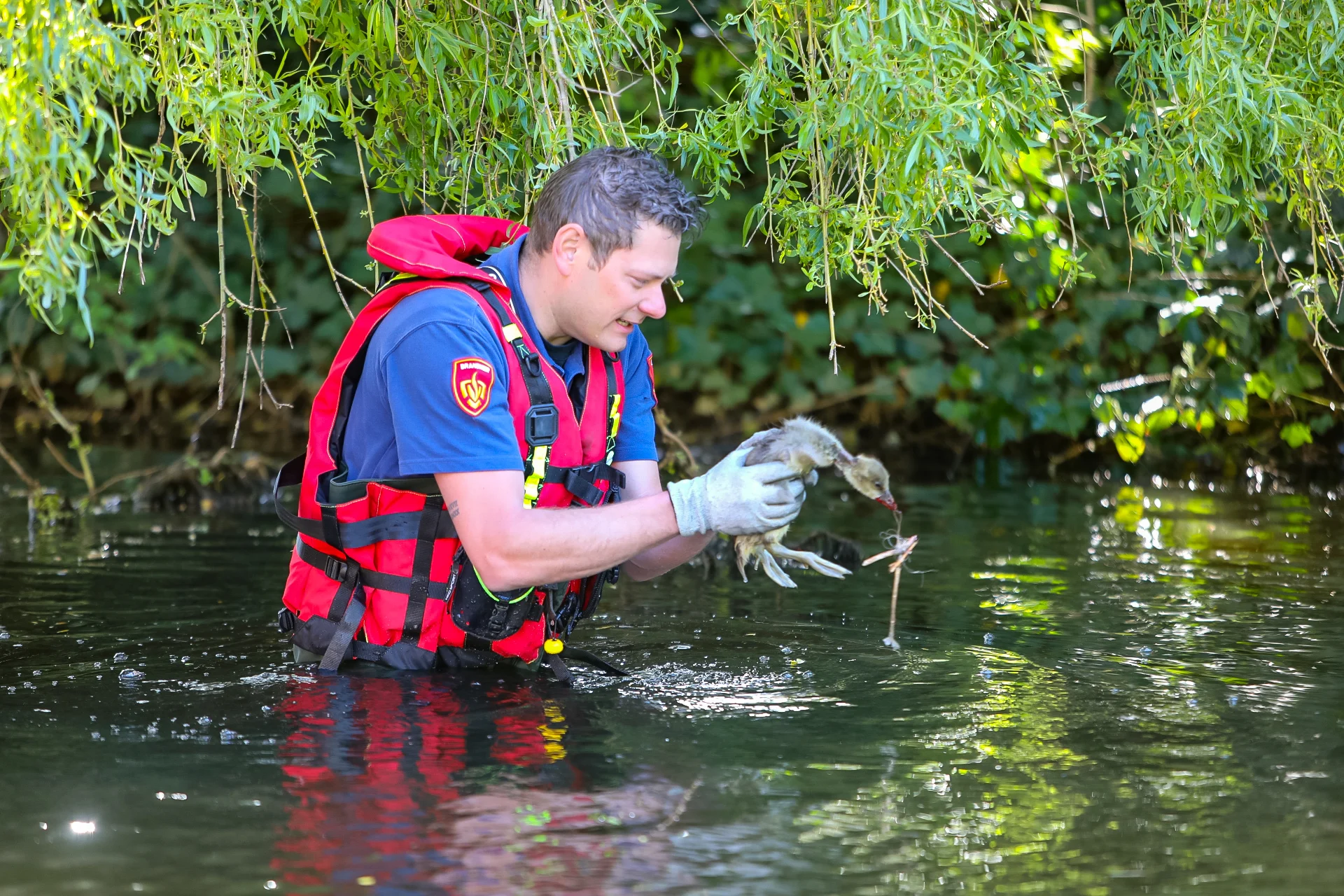 Direct belt Gerrit naar de lokale dierenambulance. Zij schakelen vervolgens de brandweer in. "De brandweer was er binnen vijf minuten. Ze hebben het gansje snel bevrijd door de vislijn door te knippen. Een dierenarts gaat naar het gansje kijken en hopelijk kan het dier weer snel bij de familie in de vijver worden uitgezet."