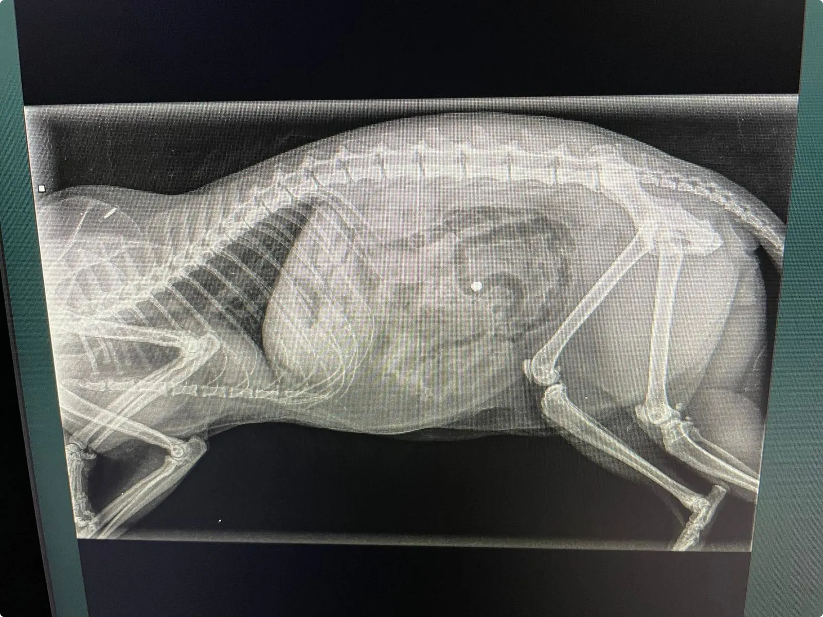 Dierenarts Jos Hermens denkt ook aan een vergiftiging. Maar tijdens het onderzoek ziet hij een gaatje. "Aan de linkerkant. Op de röntgenfoto was het meteen duidelijk te zien", zegt Hermens. Het beestje was beschoten met een luchtbuks. "Het kogeltje is er aan de linkerkant in gegaan en aan de rechterflank in de spieren gestopt."