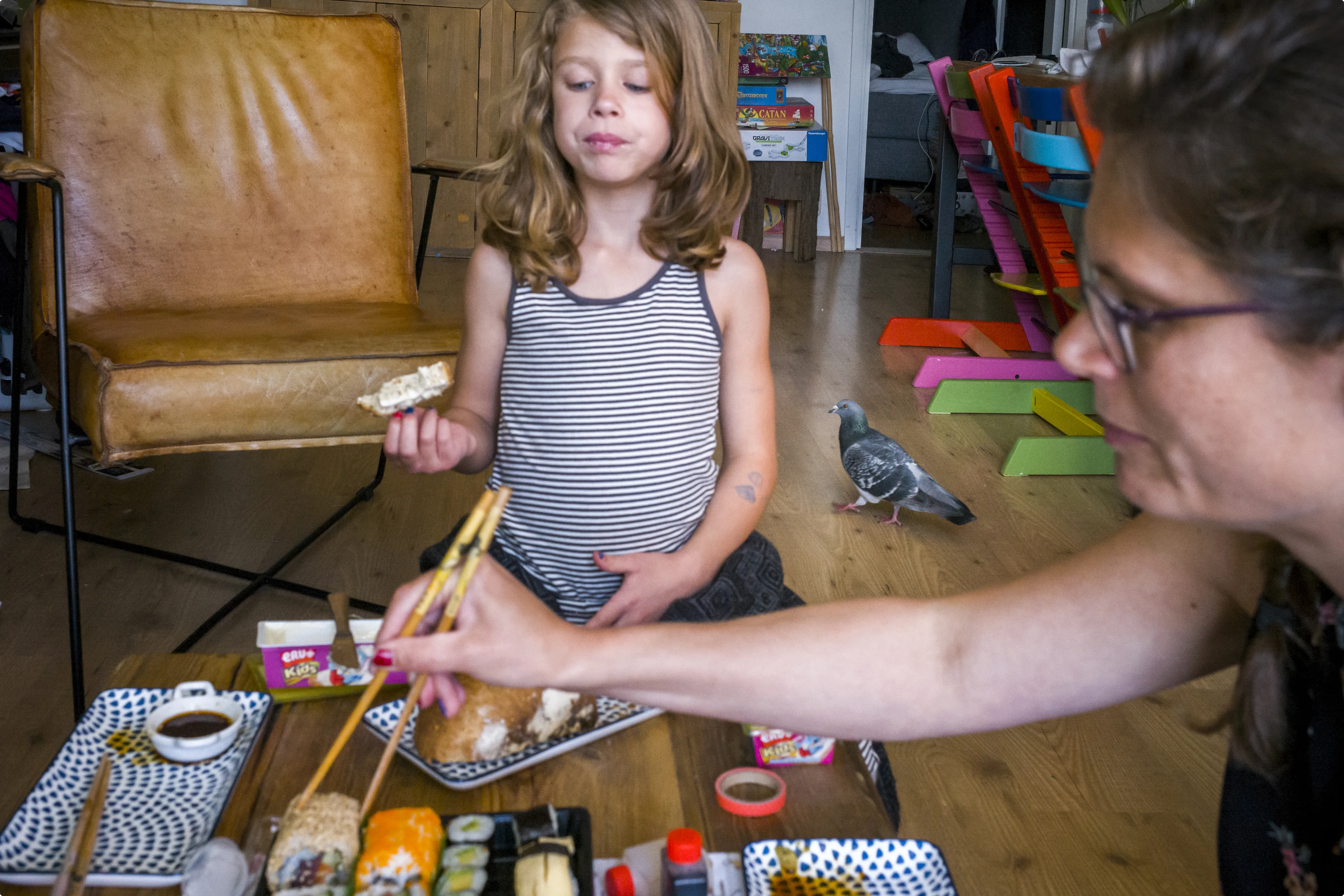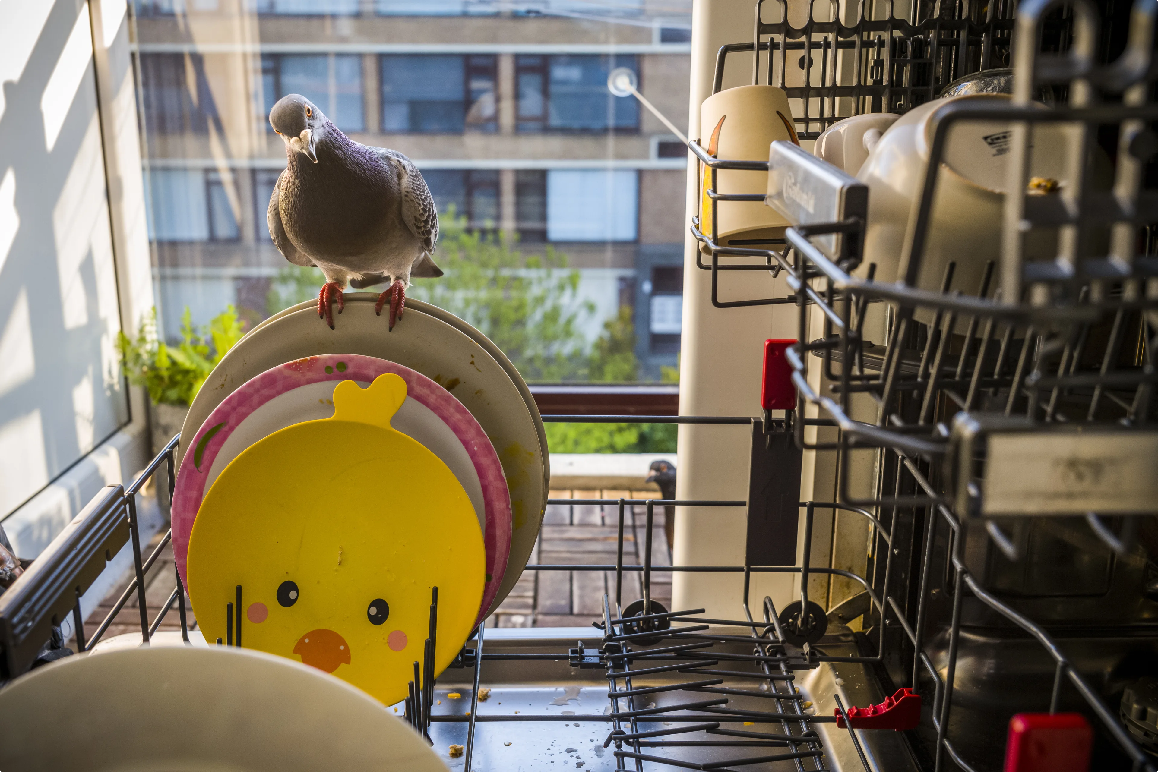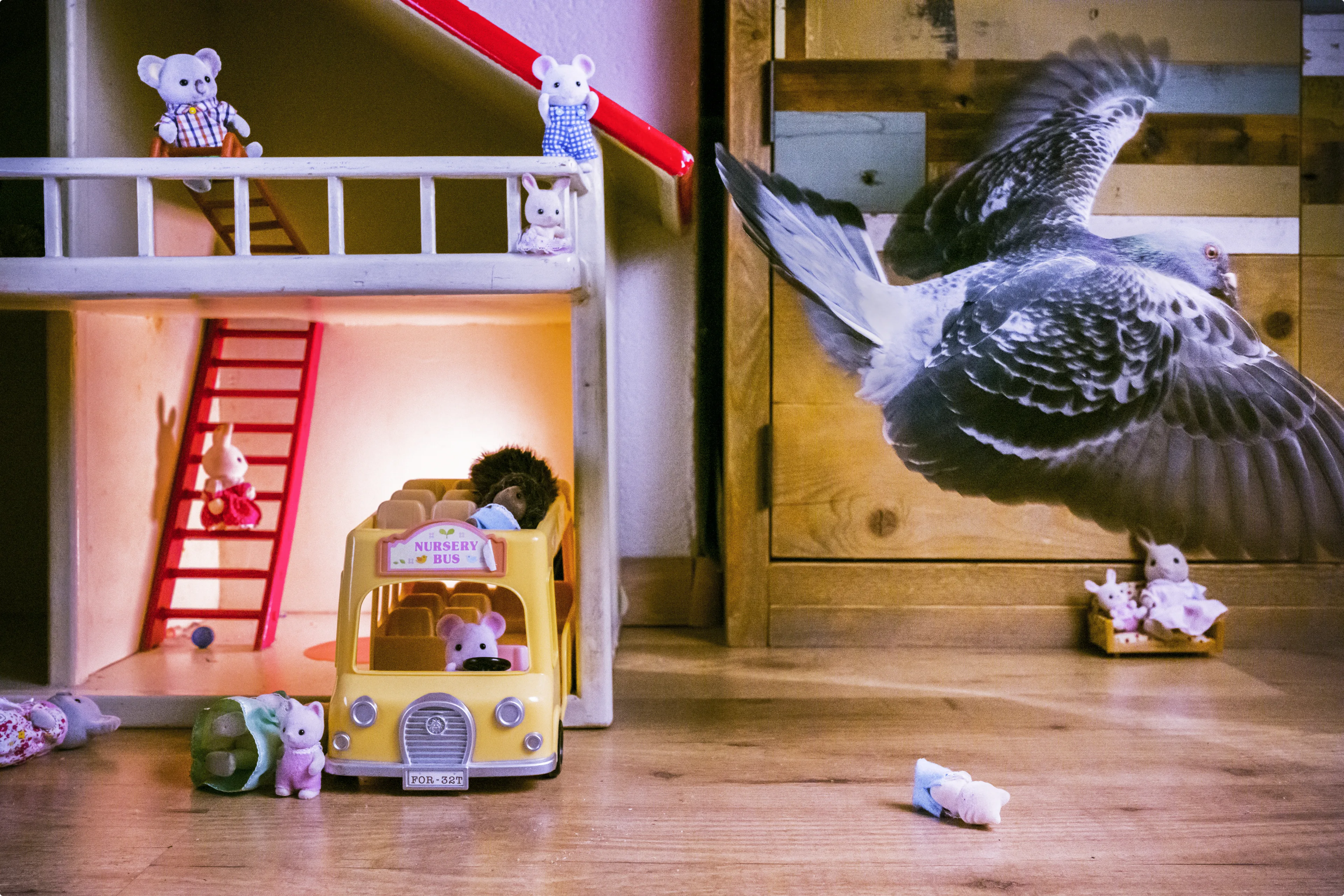 De prijswinnende serie gaat volgens de fotograaf over "het spanningsveld tussen zijn gezin en de duiven". Die werden gaandeweg steeds brutaler. Af en toe zetten de dieren zelfs voet in de woonkamer, zo valt op de kiekjes te zien.