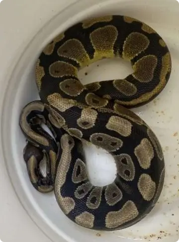 "Toen wij arriveerden stond er een man recht voor ons met de slang in zijn handen." Zo konden ze de slang gemakkelijk overnemen en meenemen naar hun basis. Daar bleek dat het een mannetje was en dat hij vervellingsproblemen heeft.