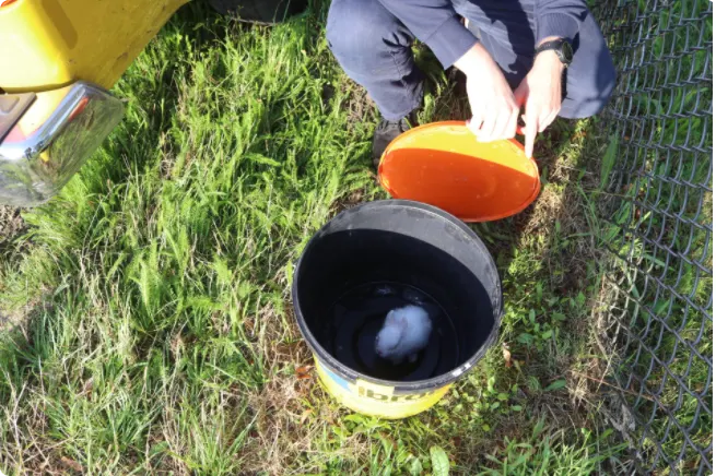 Een medewerker van de provincie haalt het konijntje zo snel mogelijk van de gevaarlijke provinciale weg af en stopt het veilig in een emmer. De dierenambulance heeft het diertje opgehaald en onderzoekt nu van wie de konijn is.