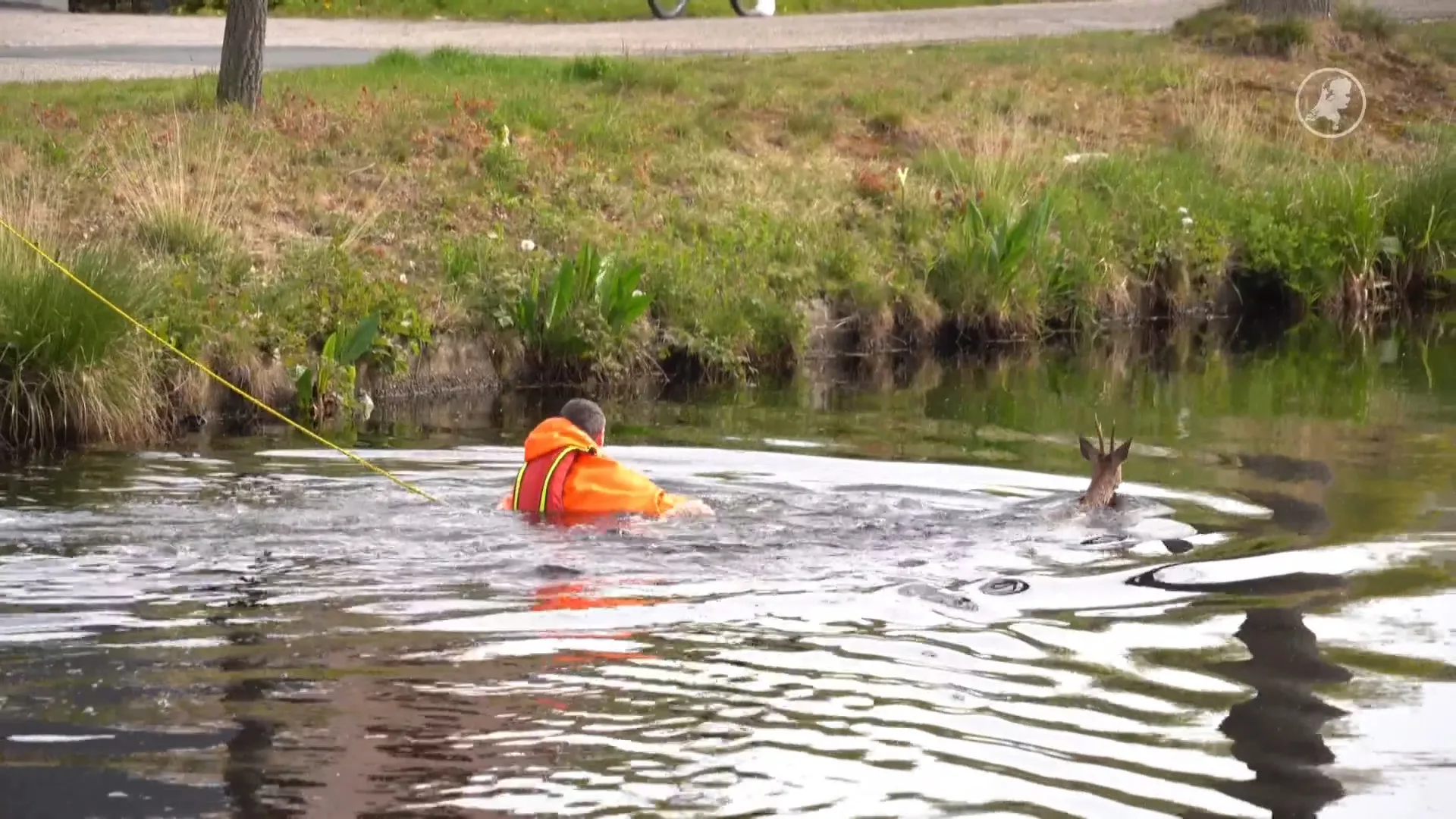 Een ree in nood is maandagochtend door de brandweer gered uit het water in Assen. De ree wordt op een geschikte locatie in de natuur weer vrijgelaten.