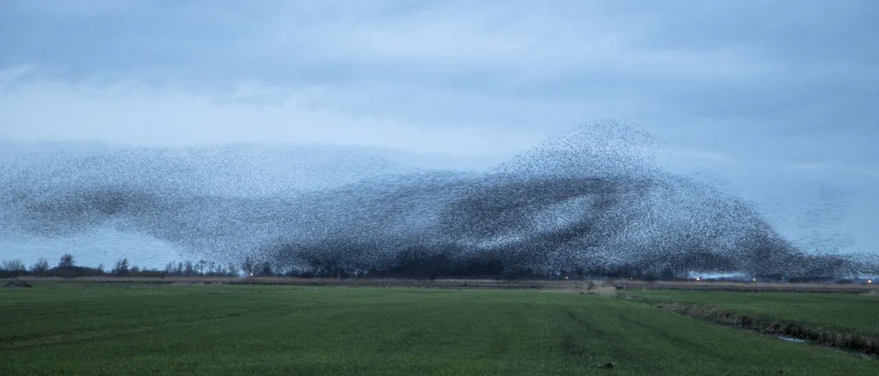 Vanaf een afstandje lijken de vogels zich te gedragen als een. Maar hoe kan het dat de vogels niet op elkaar klappen? Volgens het It Fryske Gea, de provinciale vereniging voor natuurbescherming in Friesland, ligt dat aan twee dingen. Ten eerste vliegen de spreeuwen allemaal zo'n 36 kilometer per uur. Want remmen of versnellen kost te veel energie. Dat maakt samen vliegen al makkelijker, want bots maar eens met iemand die precies even hard gaat. Dat kan alleen als je de bocht om gaat. Dan zou het dus alleen fout kunnen gaan in de bocht. Maar ook daarvoor hebben de vogels iets bedacht. Iedere vogel houdt maximaal zeven buurvogels in de gaten en zorgen dat ze daar niet tegenaan vliegen. Als een paar spreeuwen van koers veranderen, dan verspreidt die beweging zich dus door de hele wolk. Het komt wel vaker voor dat spreeuwen dit doen, maar zo veel bij elkaar zie je zelden. Beeld: Noormannen