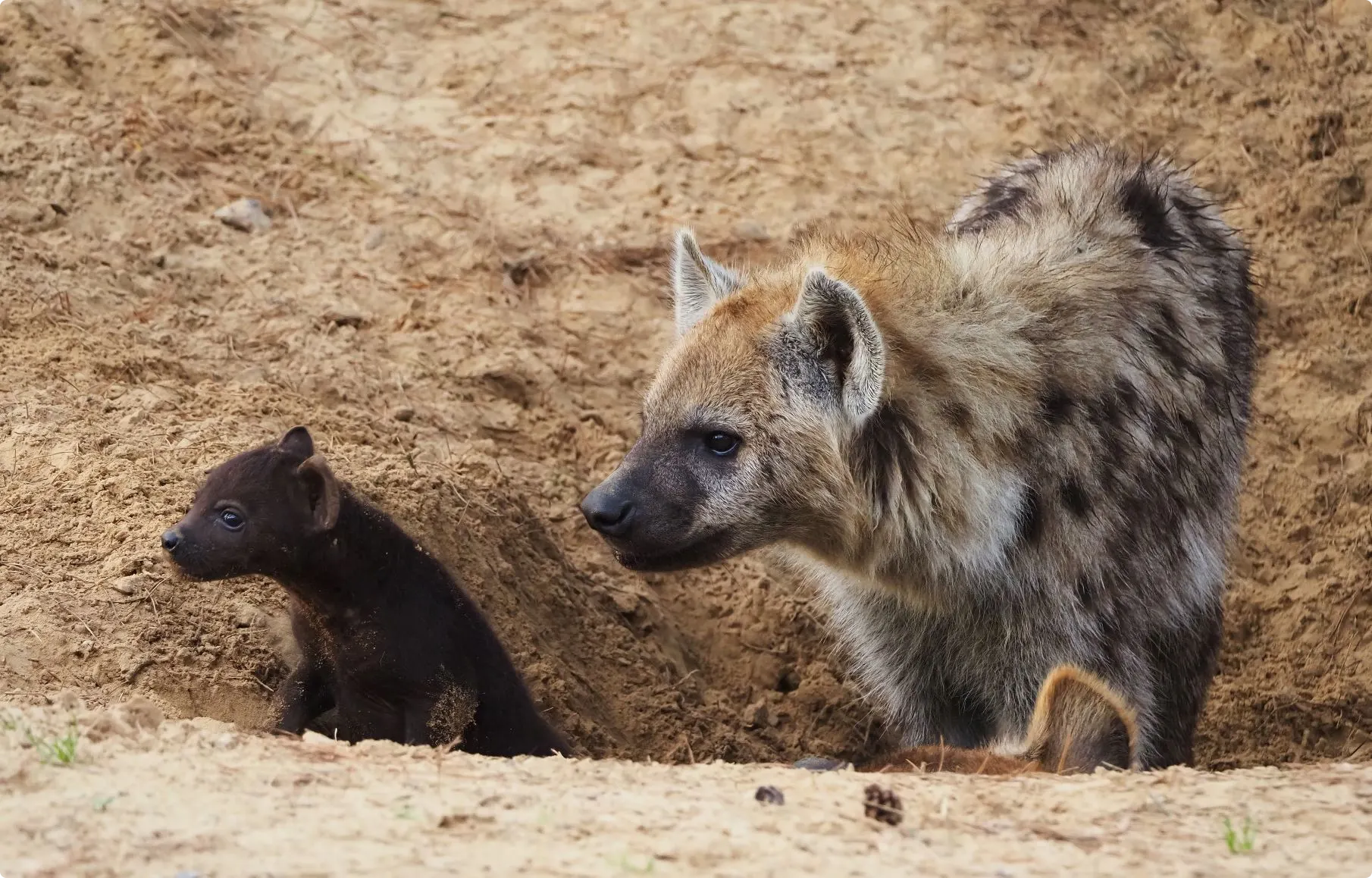De jonge hyena’s zijn hier de eerste vier maanden te vinden. Inmiddels komen de twee af en toe uit het hol tevoorschijn.