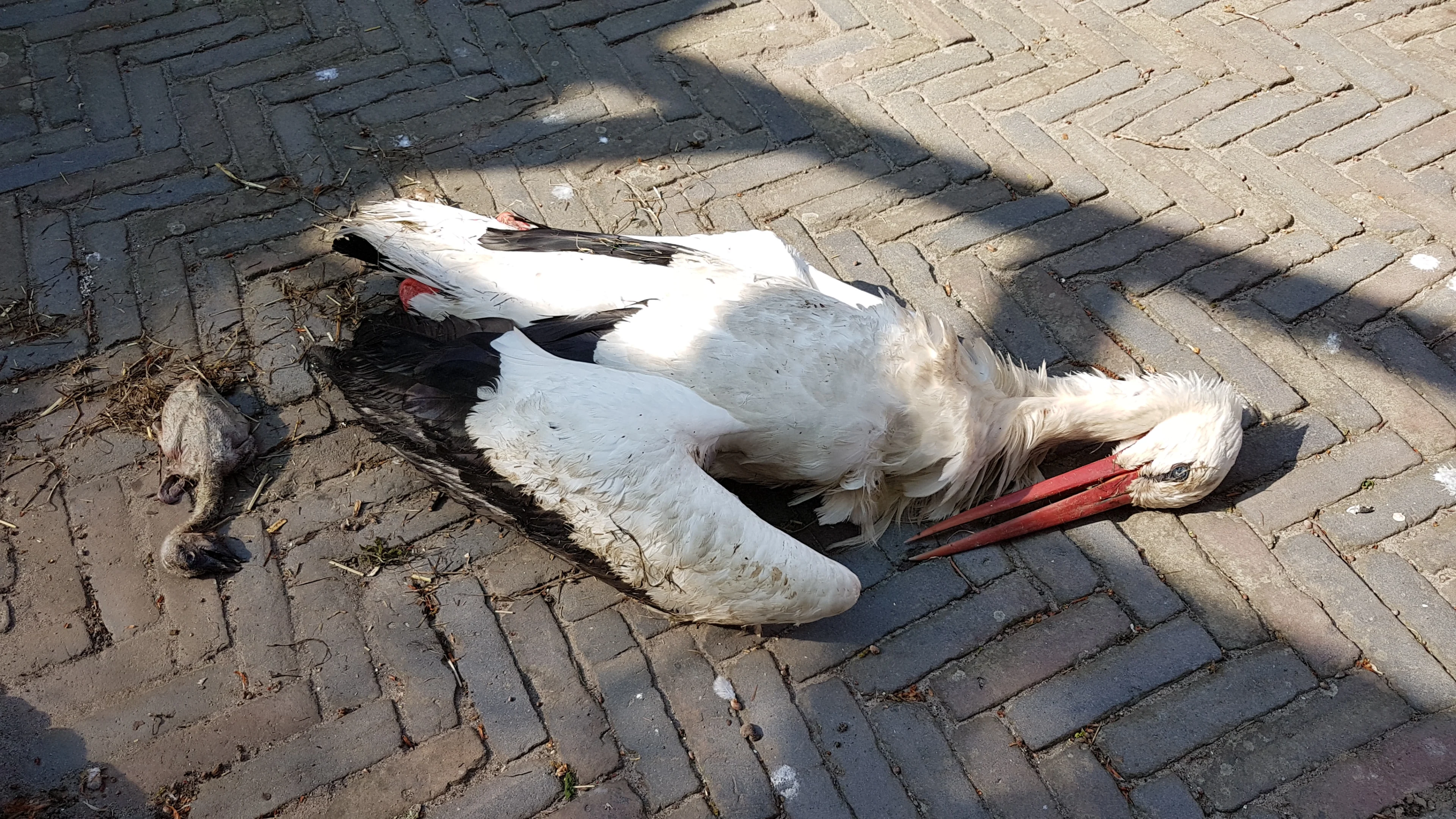 Vervolgens is met een telefoon aan een stok een filmpje gemaakt van het nest, om te kijken wat daar aan de hand was. “Toen was te zien dat er een dode ooievaar in het nest lag. Die was in elkaar gezakt en op één van de vijf jongen terecht gekomen. Dat jong was daardoor doodgedrukt.” Sander weet niet waardoor vader ooievaar is overleden. De ooievaar is zowel inwendig als uitwendig grondig onderzocht, maar er is niks geks gevonden. Volgens Sander is het meest waarschijnlijke dat de ooievaar plots een hartstilstand heeft gekregen.