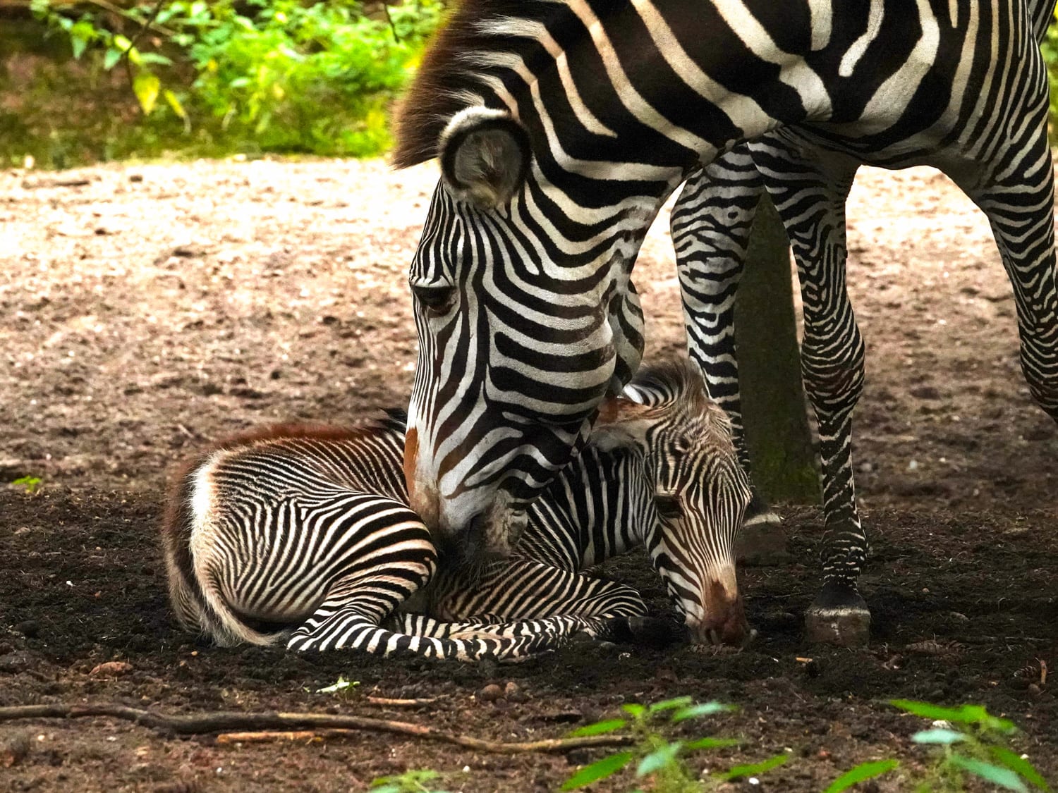 Beschuit met zwart-witte muisjes in Dierenpark Amersfoort: zondagmiddag werd hier een Grévy-zebra geboren. Dit soort is een bedreigd ras, de populatie is in de afgelopen eeuw de helft minder geworden. Het dier huppelt na een dracht van meer dan een jaar nu vrolijk rond in de Amersfoortse 'Savanne'.