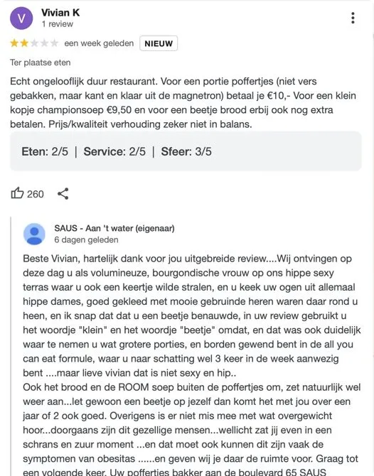 Vivian K. bezocht het restaurant Saus Aan 't Water in Bergen op Zoom en uitte haar teleurstelling in een Google-review. Ze beklaagde zich over de prijs-kwaliteitverhouding: "Echt ongelooflijk duur restaurant. Voor een portie poffertjes betaal je €10,-. Voor een klein kopje champignonsoep €9,50 en voor een beetje brood erbij ook nog extra betalen. Prijs/kwaliteit verhouding zeker niet in balans."