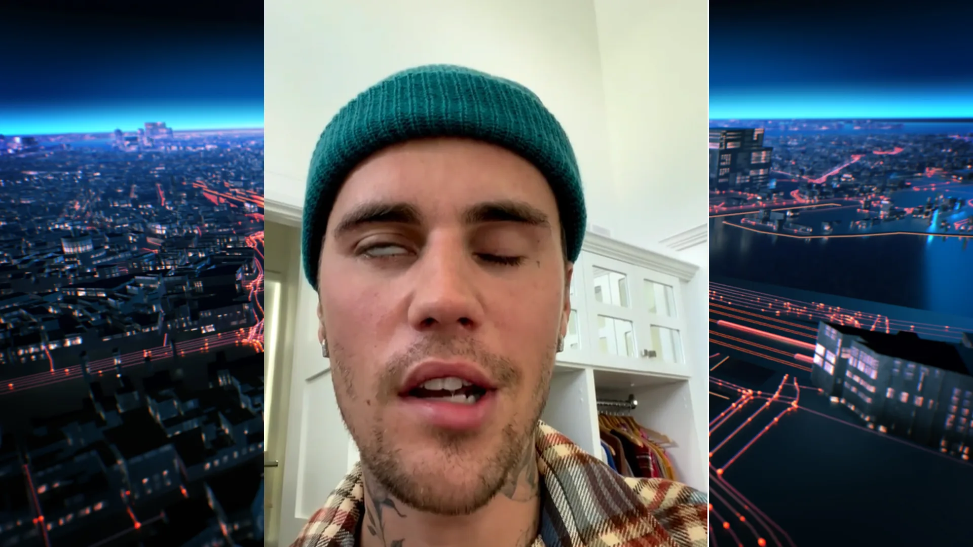 Dat komt van een soort virus dat de zenuw in zijn oor en gezicht aanvalt, zegt Bieber, "en ervoor zorgt dat mijn gezicht verlamd is." Hij wijst erop dat een van zijn ogen niet knippert. "Ik kan niet glimlachen met deze kant van mijn gezicht, deze neusvleugel kan niet bewegen, dus het is een volledige verlamming aan deze kant van mijn gezicht."