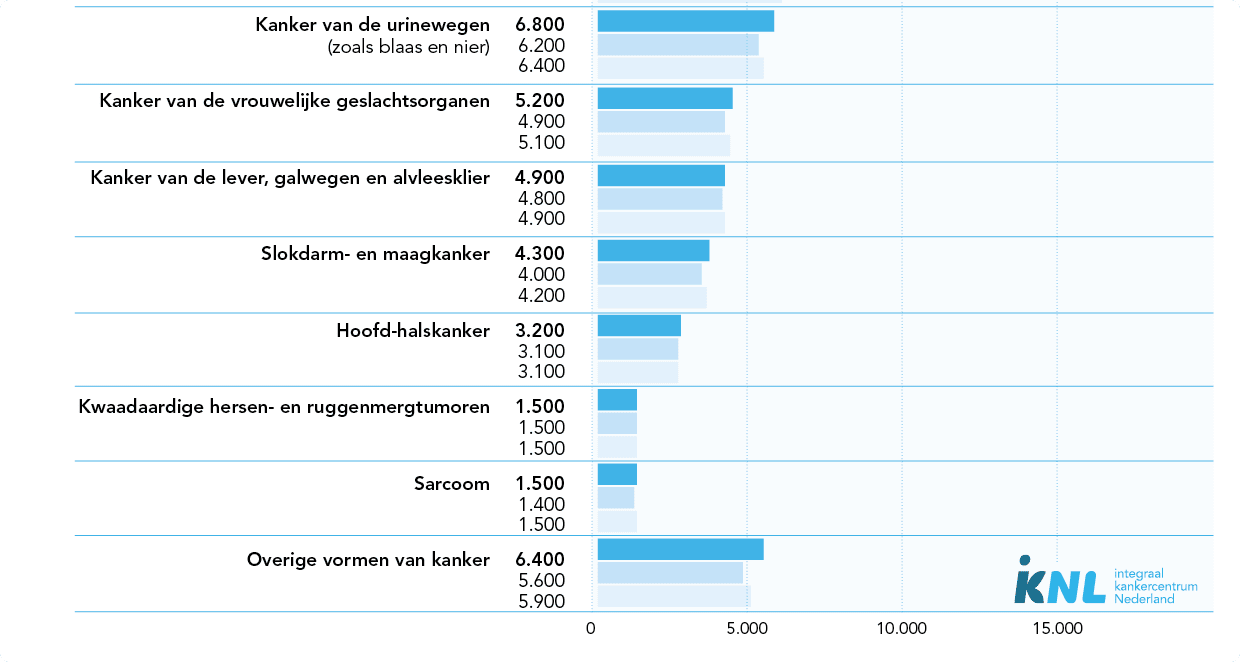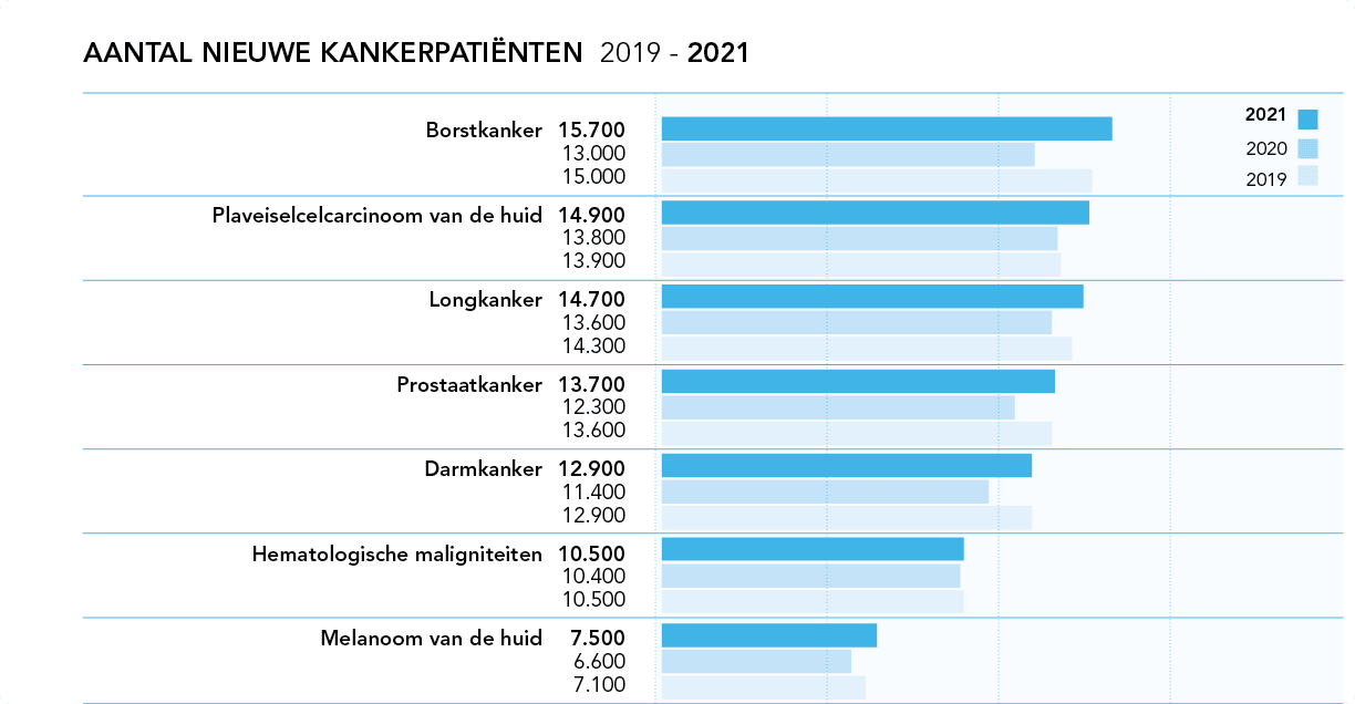 Borstkanker werd in 2021 het vaakst vastgesteld. Vorig jaar kregen 15.700 mensen deze diagnose. Ook relatief veel mensen kregen te horen dat ze plaveiselcelcarcinoom van de huid (een vorm van huidkanker) hebben (14.900 mensen). Longkanker werd bij 14.700 mensen vastgesteld, prostaatkanker bij 13.700 mannen en 12.900 mensen kregen de diagnose darmkanker.