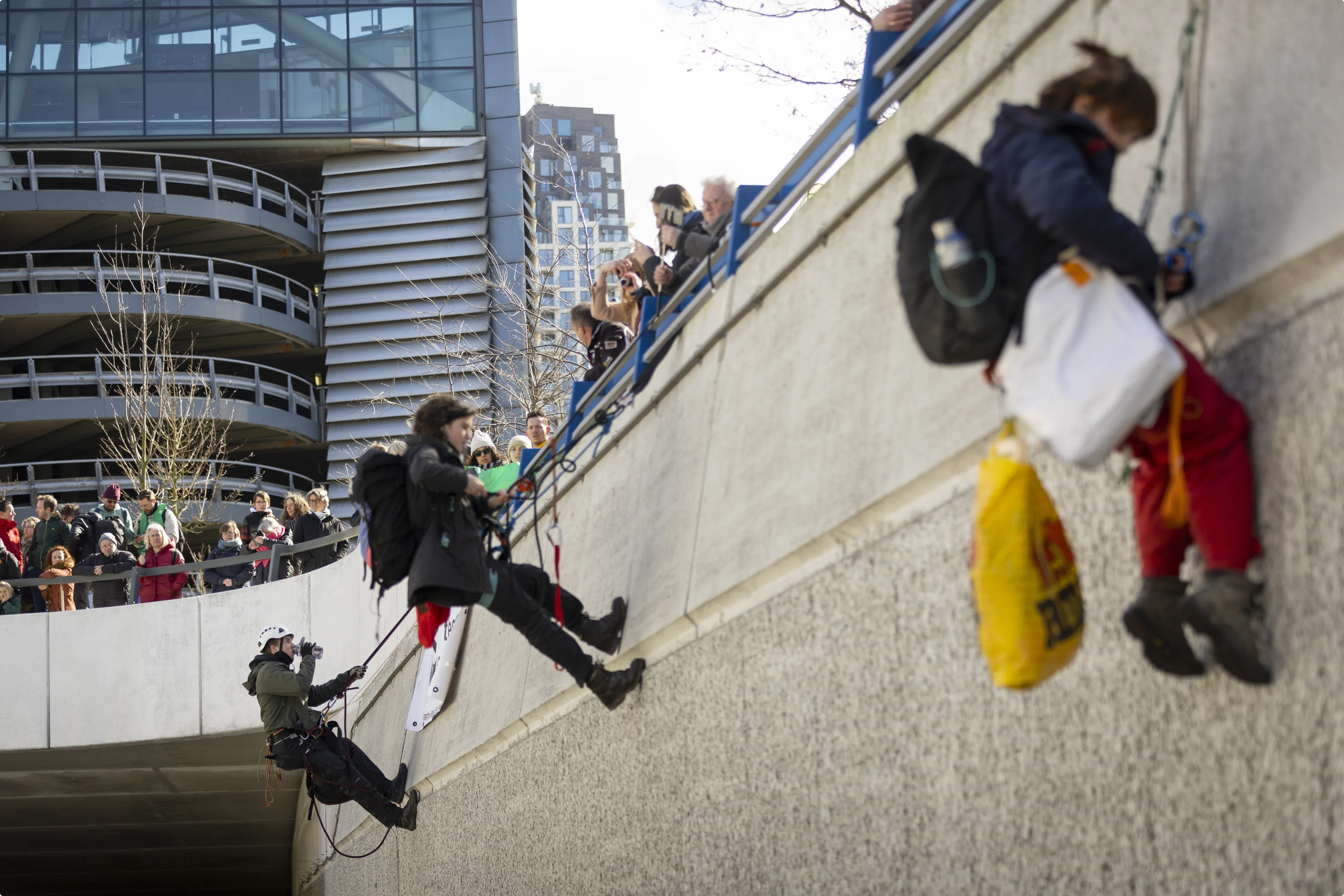 Via de tunnelwanden abseilen verschillende demonstranten van Extinction Rebellion de tunnel in. Ze worden allemaal vrijwel direct opgepakt door agenten die ze beneden opwachten.