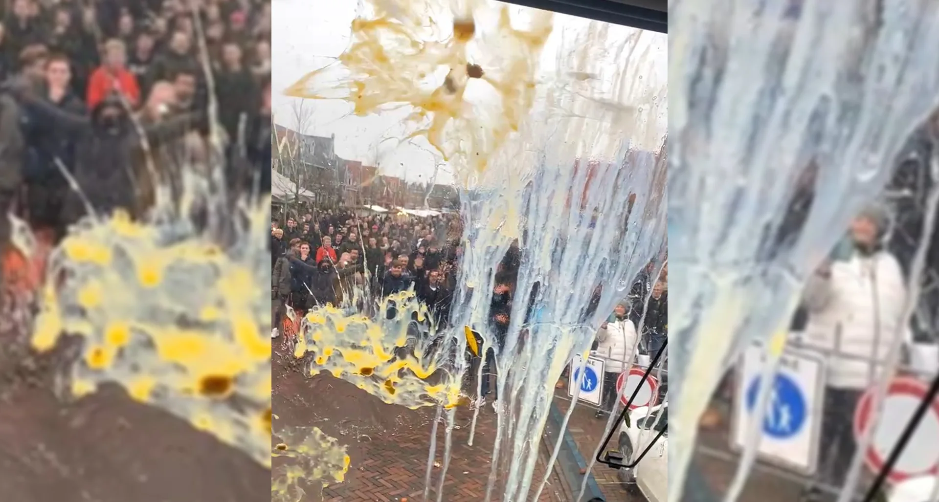 De bus werd bekogeld met eieren en oliebollen. Ook werd er vuurwerk gegooid richting de bus. De politie hield de tegenstanders wel op afstand maar greep niet in toen de bus werd bekogeld. Toen de bus het dorp verliet, liep een groep mee om de demonstranten provocerend 'uit te zwaaien'.
