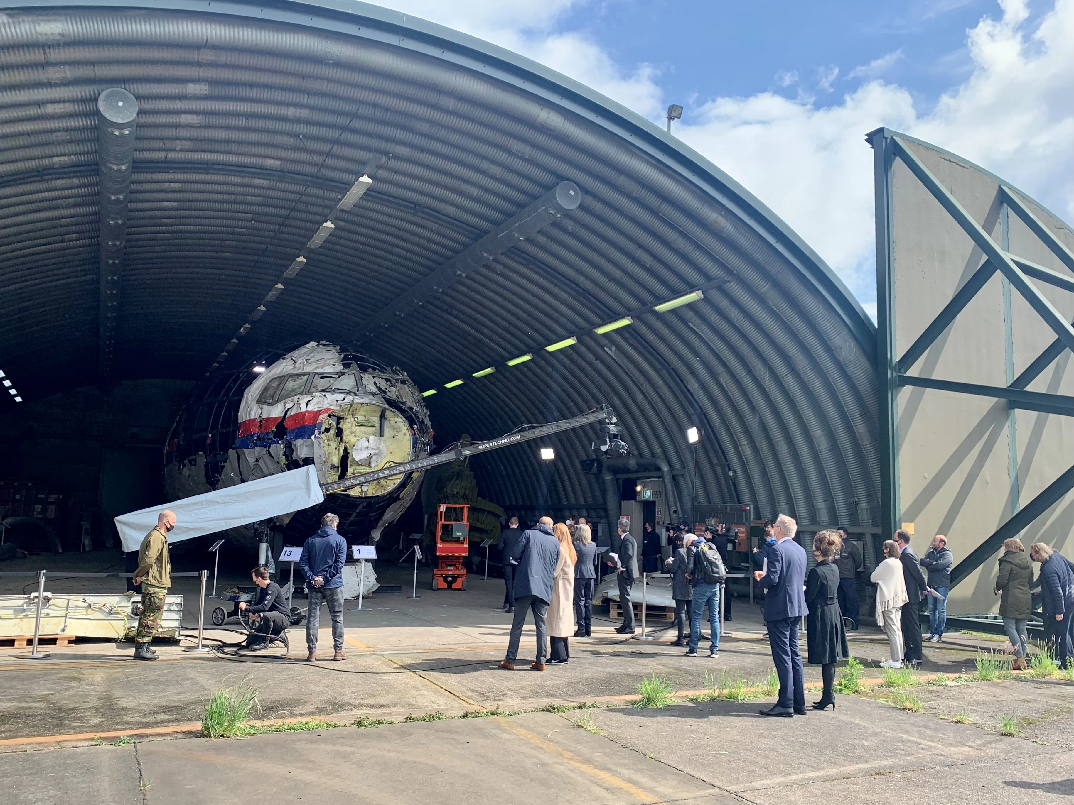 De rechtbank Den Haag is woensdagochtend begonnen met de schouw van het neergestorte vliegtuig MH17 op de vliegbasis in het Brabantse Gilze-Rijen. Voor de gelegenheid is naast de hangar waar het toestel in staat, een grote tent ingericht die dienst doet als rechtbank. De voorzitter van de rechtbank sprak van 'een bijzondere locatie'. "De rechtbank benadrukt dat dit bezoek bij nabestaanden een emotionele lading zal hebben. Het gaat hier om het vliegtuig waarmee hun dierbaren onderweg waren naar een bestemming die zij nooit hebben bereikt", zei hij bij aanvang van de zitting.