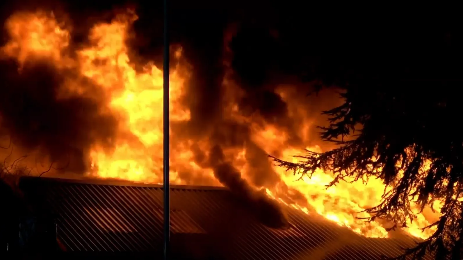 In een loods in het West-Friese Schellinkhout is een enorme brand uitgebroken. De brand is overgeslagen naar verschillende loodsen ernaast en is tot in de wijde omgeving te zien.
