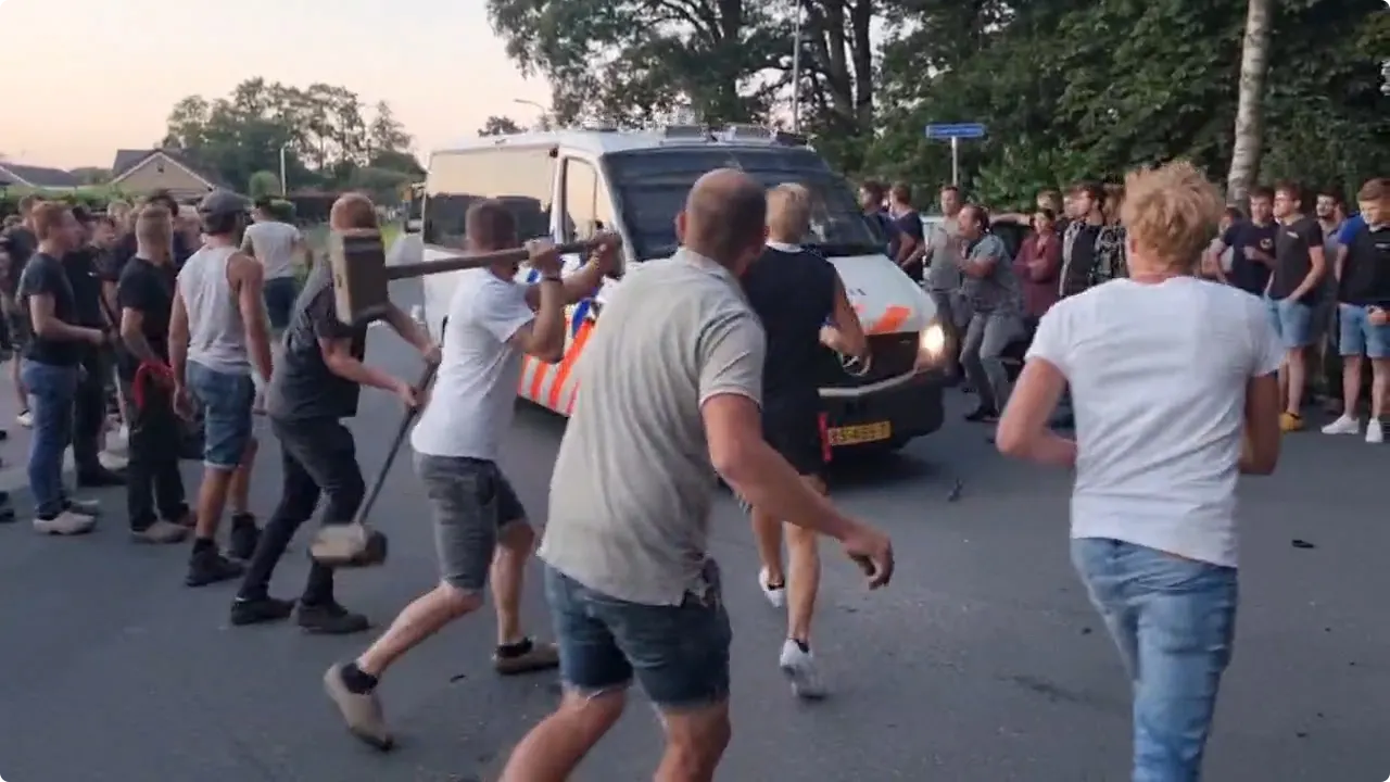 In Kootwijkerbroek is een boerenprotest volledig uit de hand gelopen. Op beelden is te zien hoe relschoppers politiebusjes belagen met grote hamers en stalen buizen.