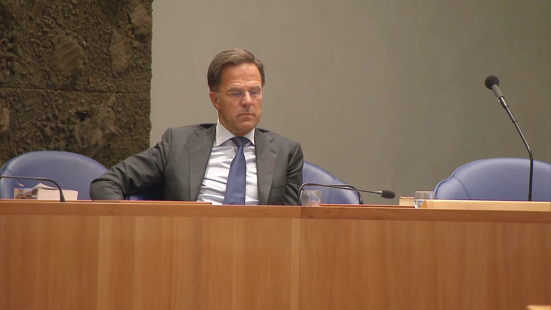 Premier Mark Rutte kan dinsdagmiddag maar moeilijk zijn ogen openhouden tijdens het 'Hoekstra-debat' in de plenaire zaal van de Tweede Kamer. Op beelden van het debat is te zien hoe Rutte af en toe aan het wegdutten is.