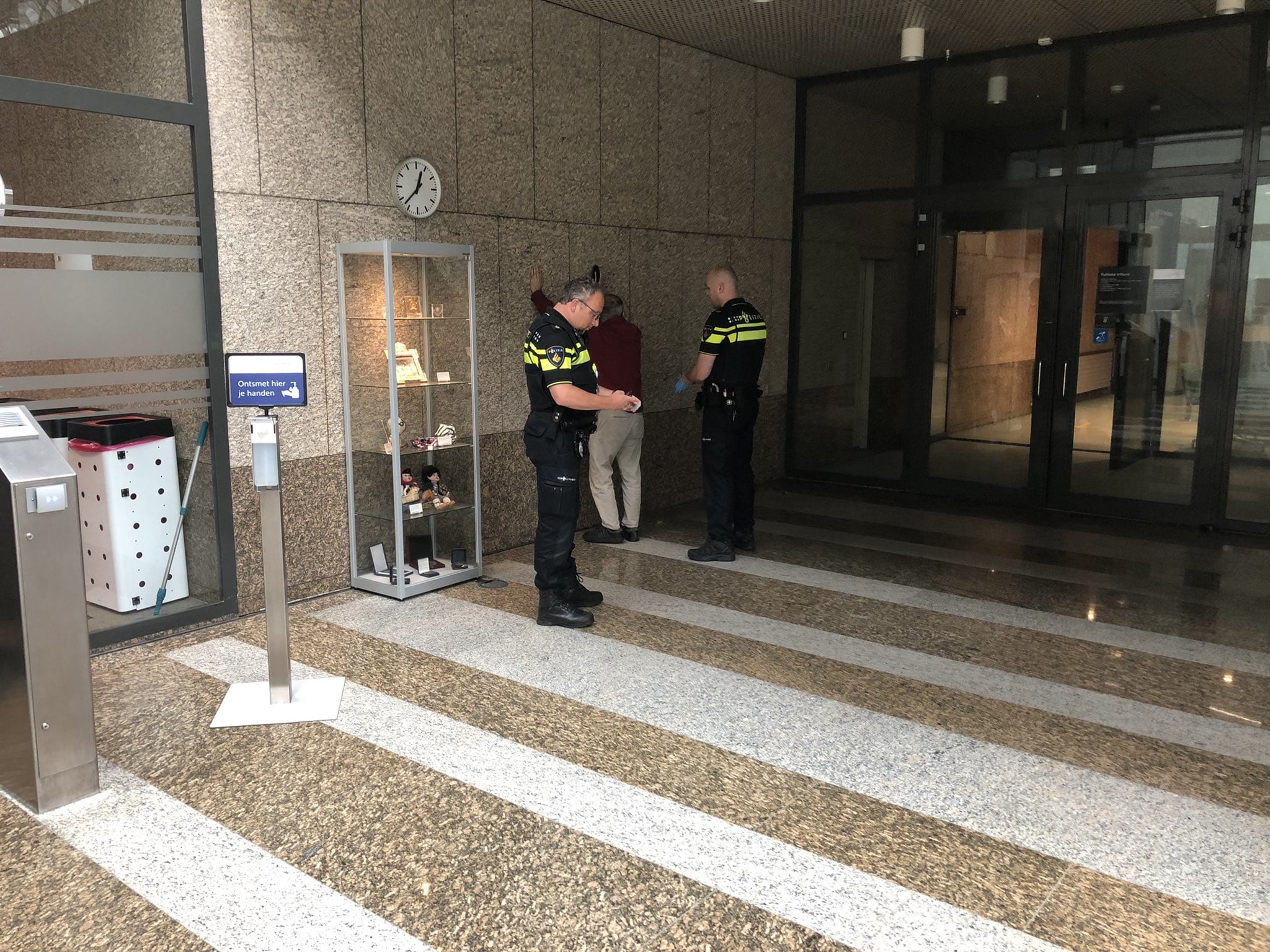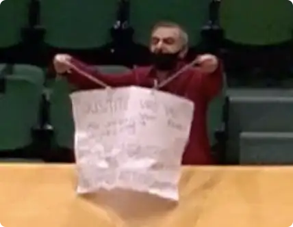 Alleen het woord 'justitie' is op beelden te ontwaren. Het debat werd direct geschorst en de man is aangehouden. Terwijl de man rustig werd afgevoerd, noemde hij zichzelf een "activist tegen justitie".