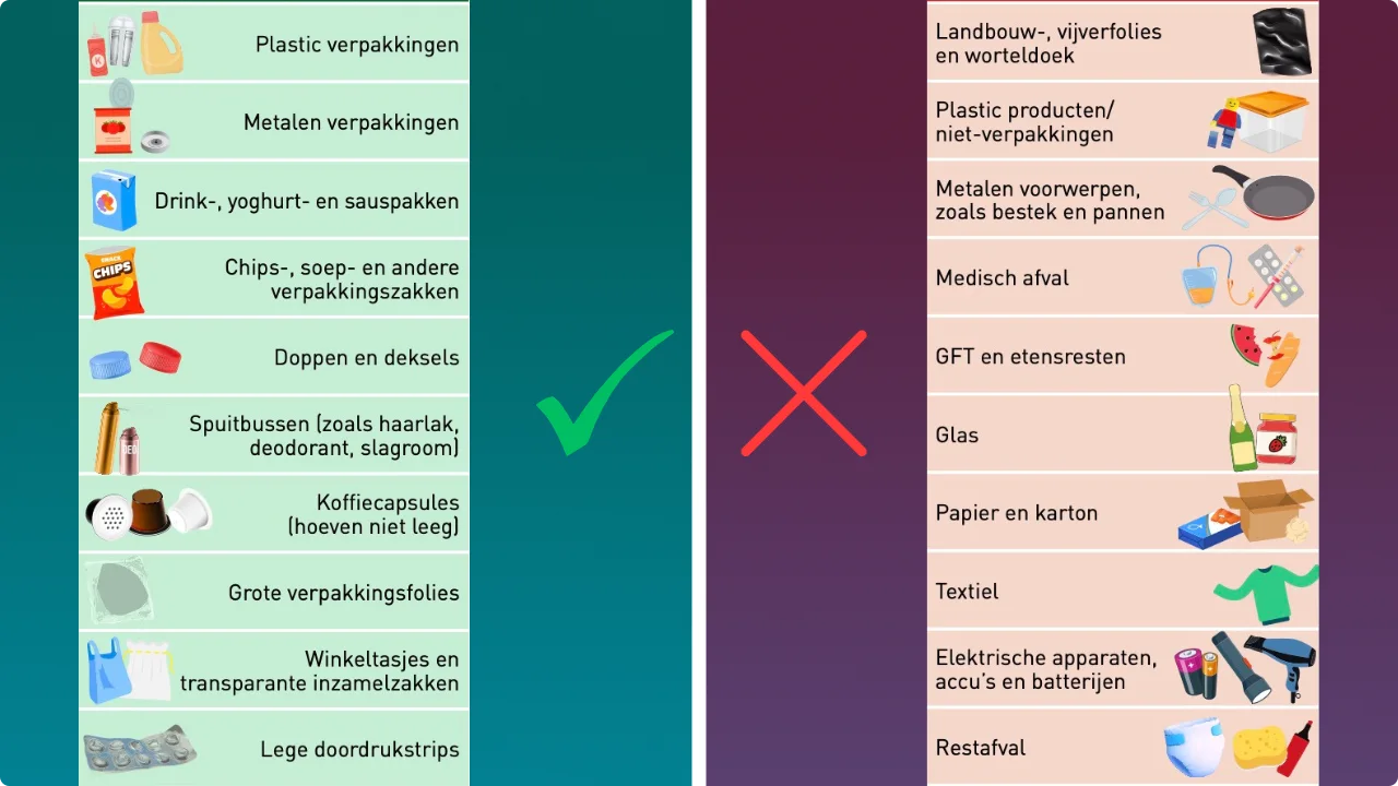 Op de vernieuwde Wel/Niet-lijst is te zien wat er bij het PMD-afval mag en wat niet.