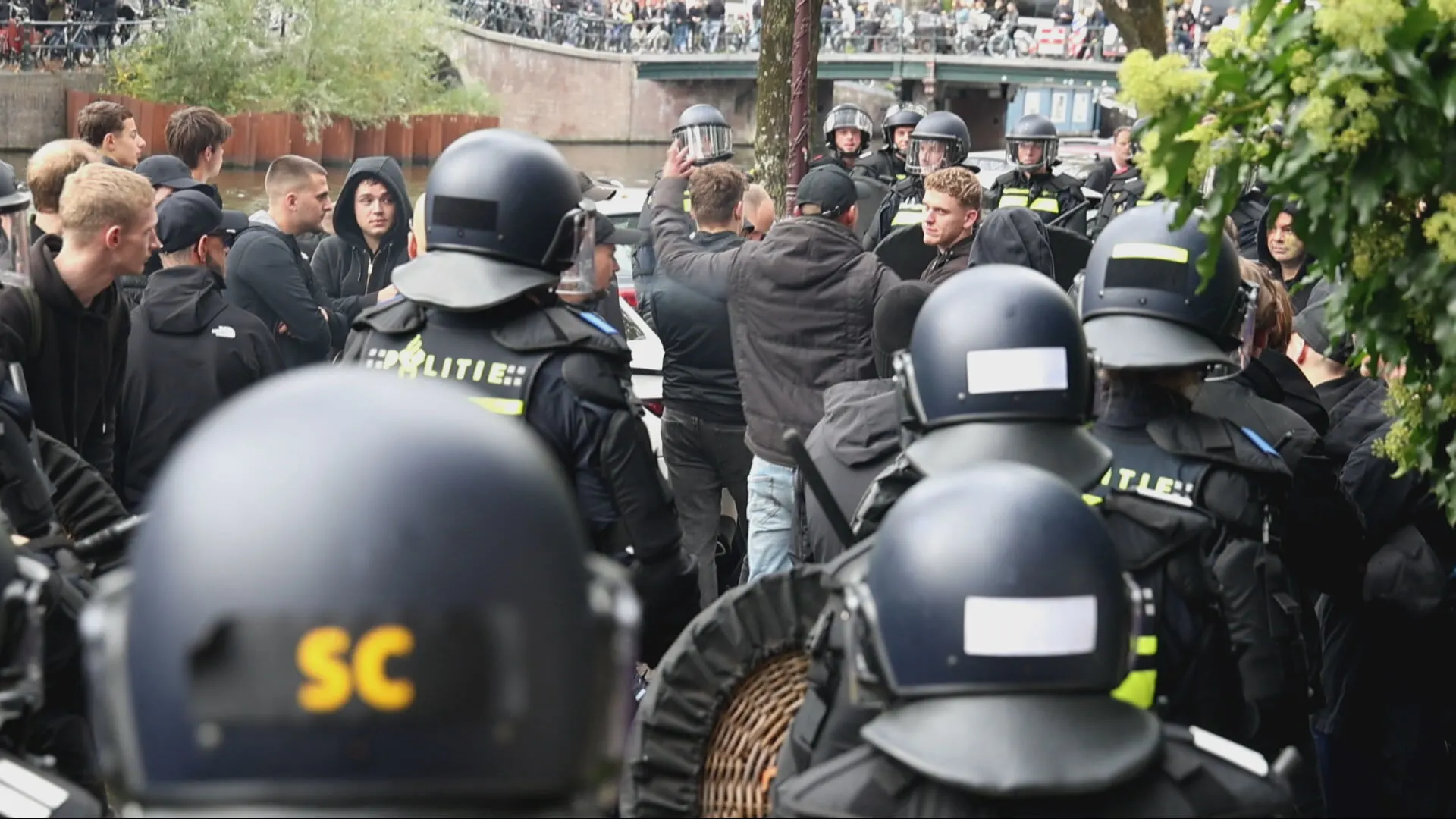 Demonstranten die na afloop toch het centrum van Amsterdam in trekken staan tegenover de politie: