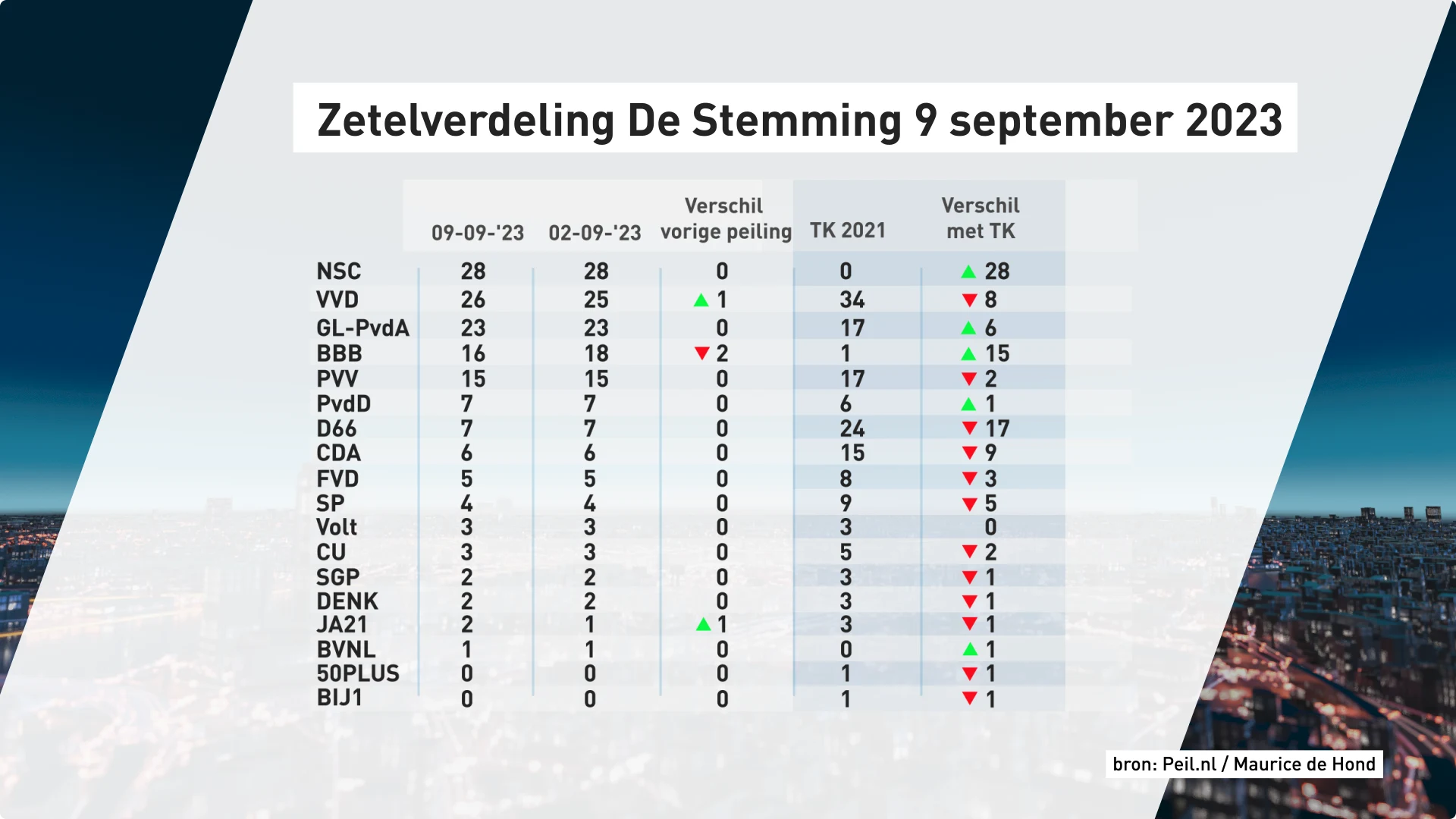 De partij Nieuw Sociaal Contract van Pieter Omtzigt blijft vooralsnog de grootste in de peiling op 28 zetels als nu de Tweede Kamerverkiezingen worden gehouden. Achter de VVD blijft GroenLinks-PvdA op de derde positie staan met 23 zetels. PVV blijft stabiel op 15 zetels, en ook Partij voor de Dieren (PvdD) en D66 behouden hun 7 zetels. Deze peiling is echter uitgevoerd voordat bekend werd dat PvdD-leider Esther Ouwehand om mogelijke integriteitsschendingen niet als lijsttrekker de verkiezingen in zal gaan. Het is dus nog onduidelijk welk effect dit heeft op de zetelverdeling.
