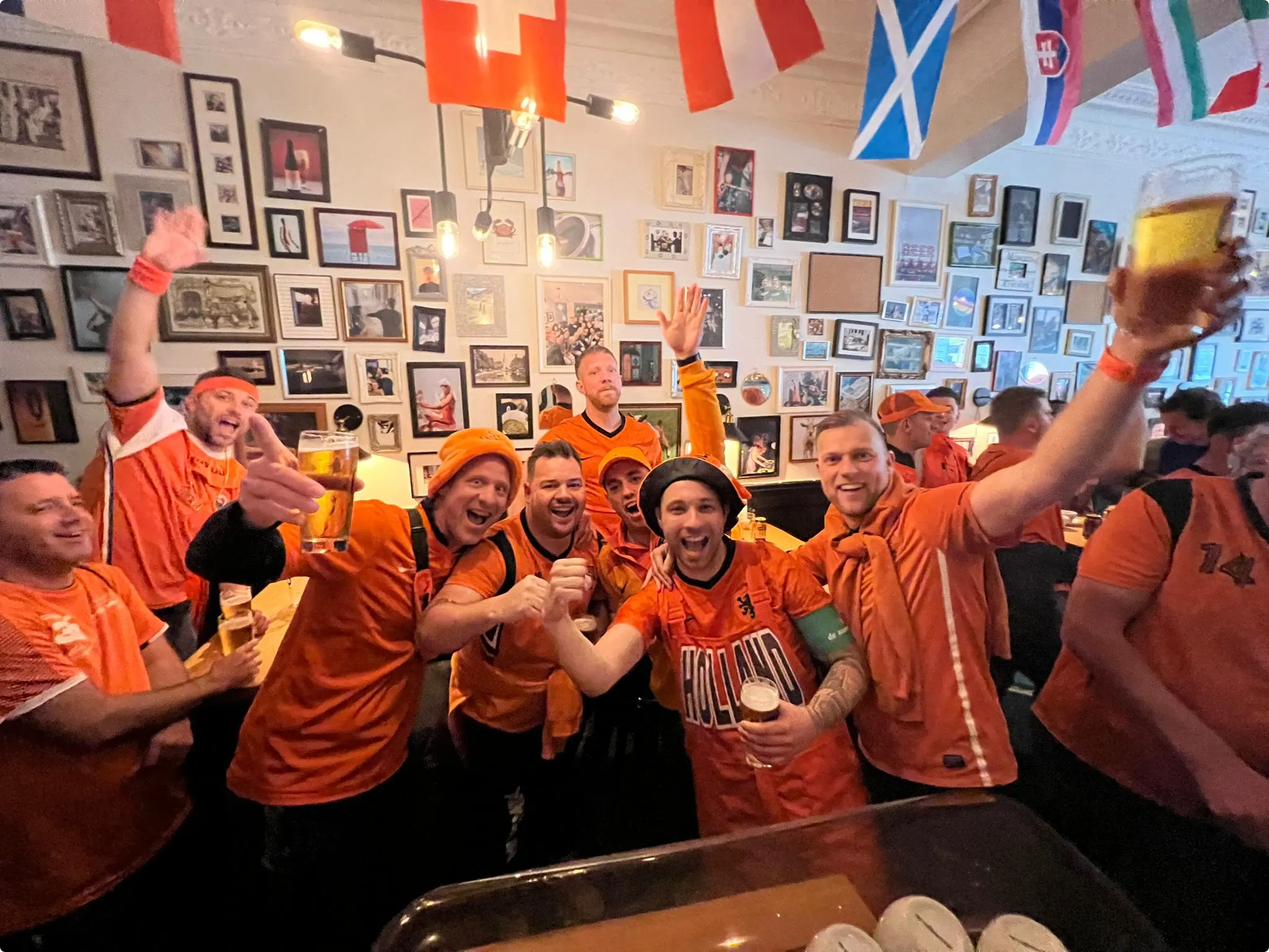 De Nederlanders die aanwezig zijn in Hamburg zijn de plaatselijke cafés ingevlucht door het weer, daar gaat het feest vrolijk verder: