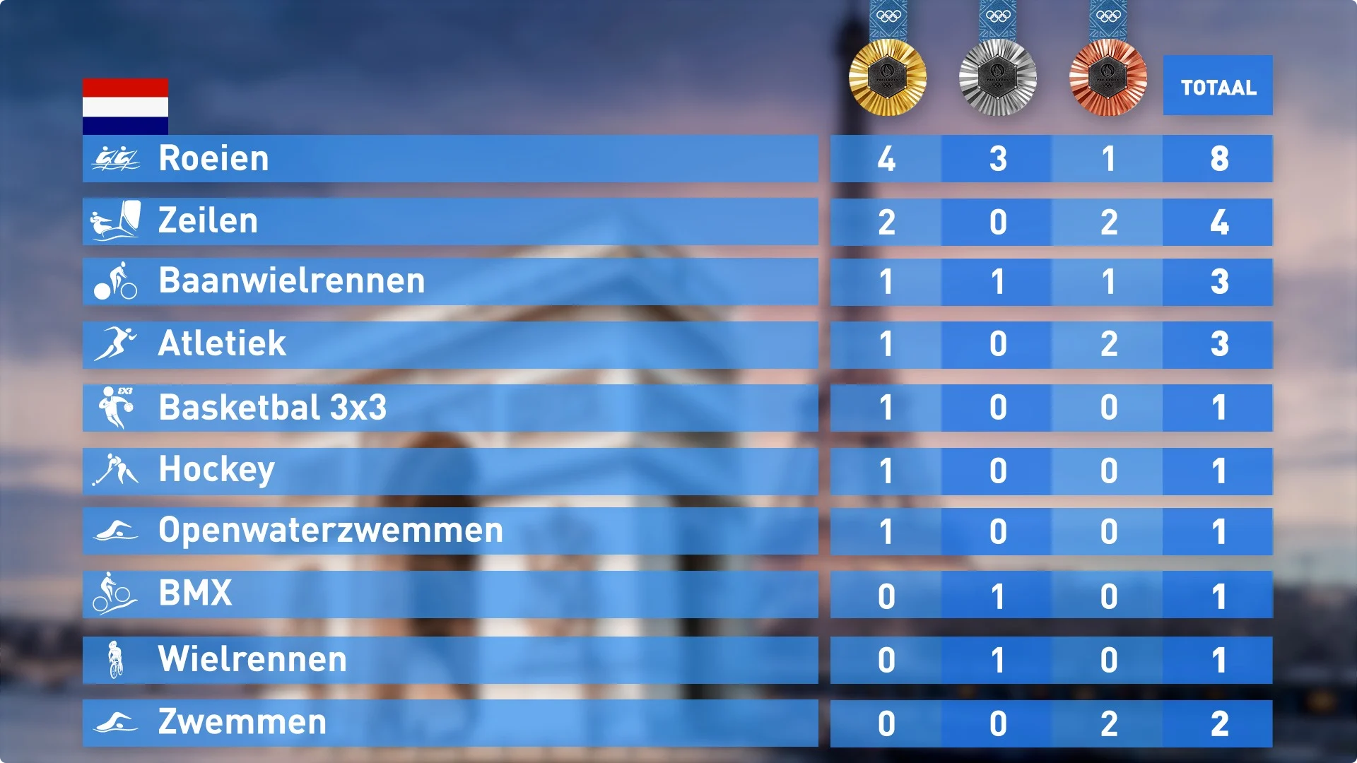 Op onderstaande foto is de medaillespiegel van TeamNL te zien per onderdeel (update 9-8, 19.25 uur):