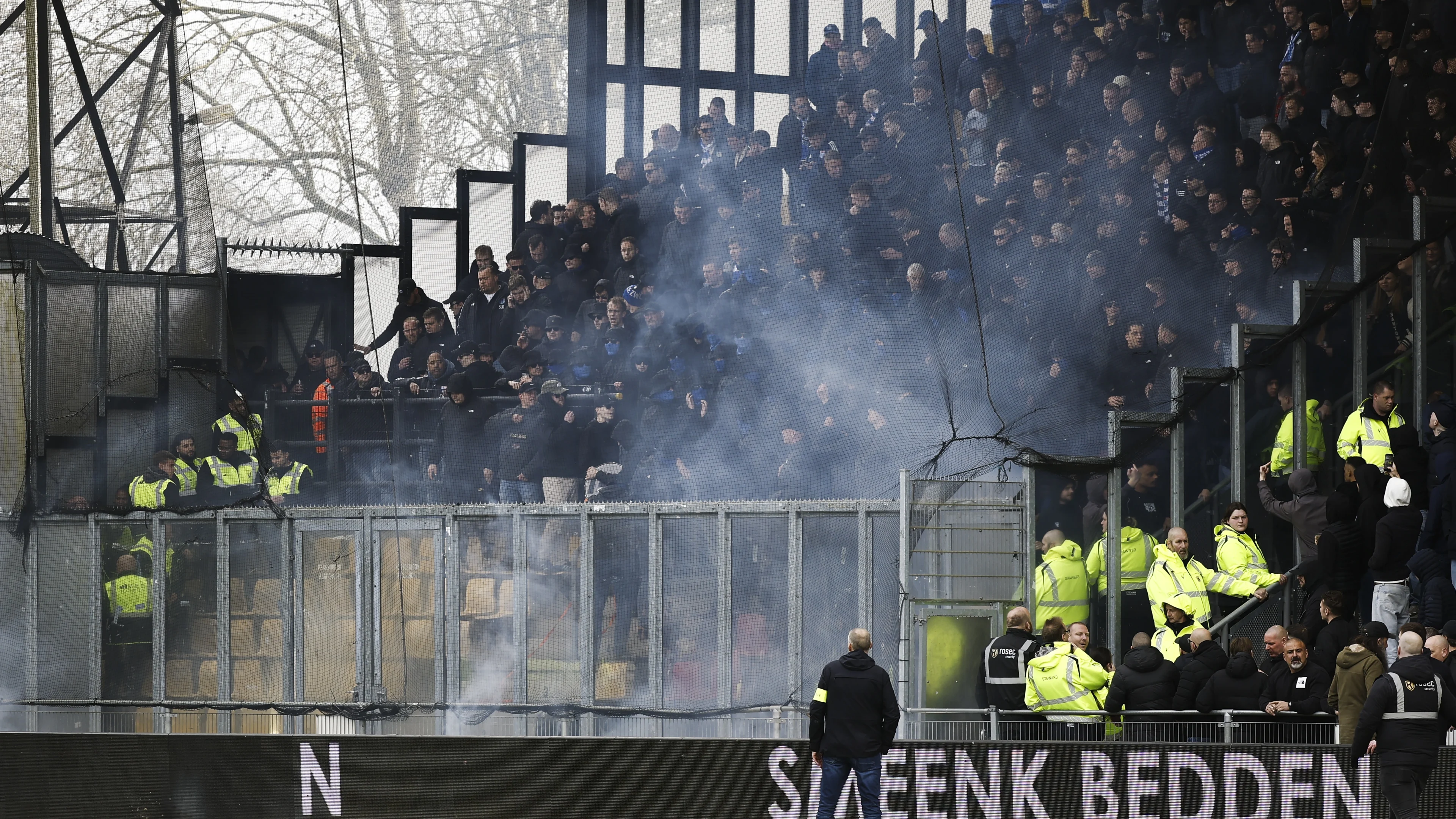 Alle aanwezige PEC-supporters werden in bussen teruggebracht naar Zwolle. Anderhalf uur later dan gepland, is het duel alsnog begonnen.