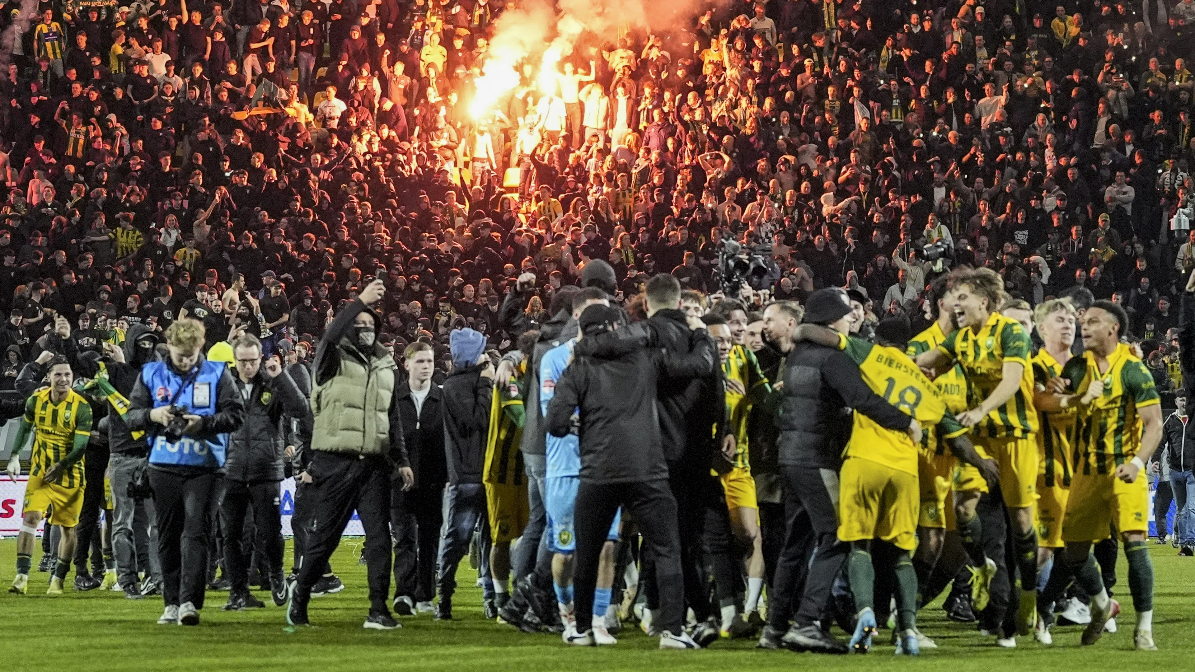 ADO Den Haag keert na 5 jaar terug naar de Eredivisie en dat zorgt voor uitzinnige taferelen. Na de 1-0 overwinning op Jong FC Utrecht stroomden fans massaal het veld op, ondanks een duidelijke oproep van de club om dat niet te doen.
