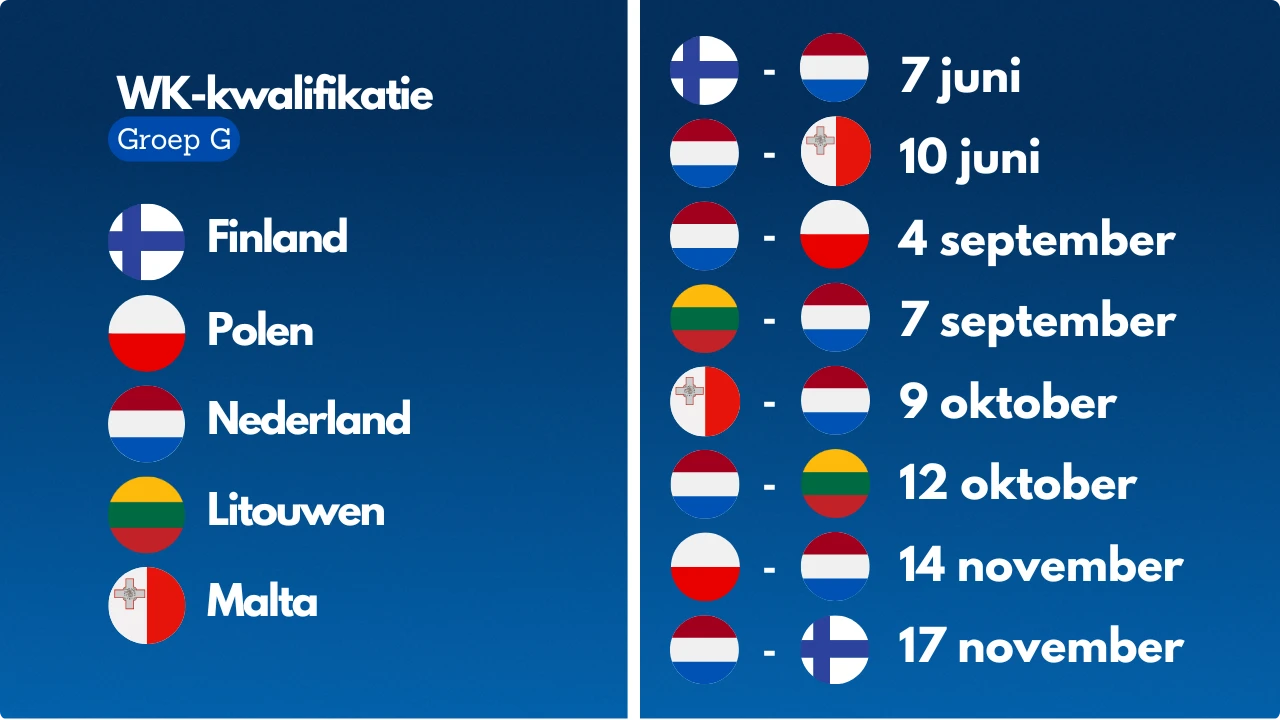 De eerste kwalificatiewedstrijden staan gepland voor juni, gelijktijdig met de finaleronde van de Nations League. Nederland trapt af op 7 juni met een uitwedstrijd tegen Finland, gevolgd door een thuisduel tegen Malta op 10 juni. De groepswinnaars plaatsen zich rechtstreeks voor het WK, terwijl de nummers 2 via play-offs nog kans maken op een van de resterende vier tickets.