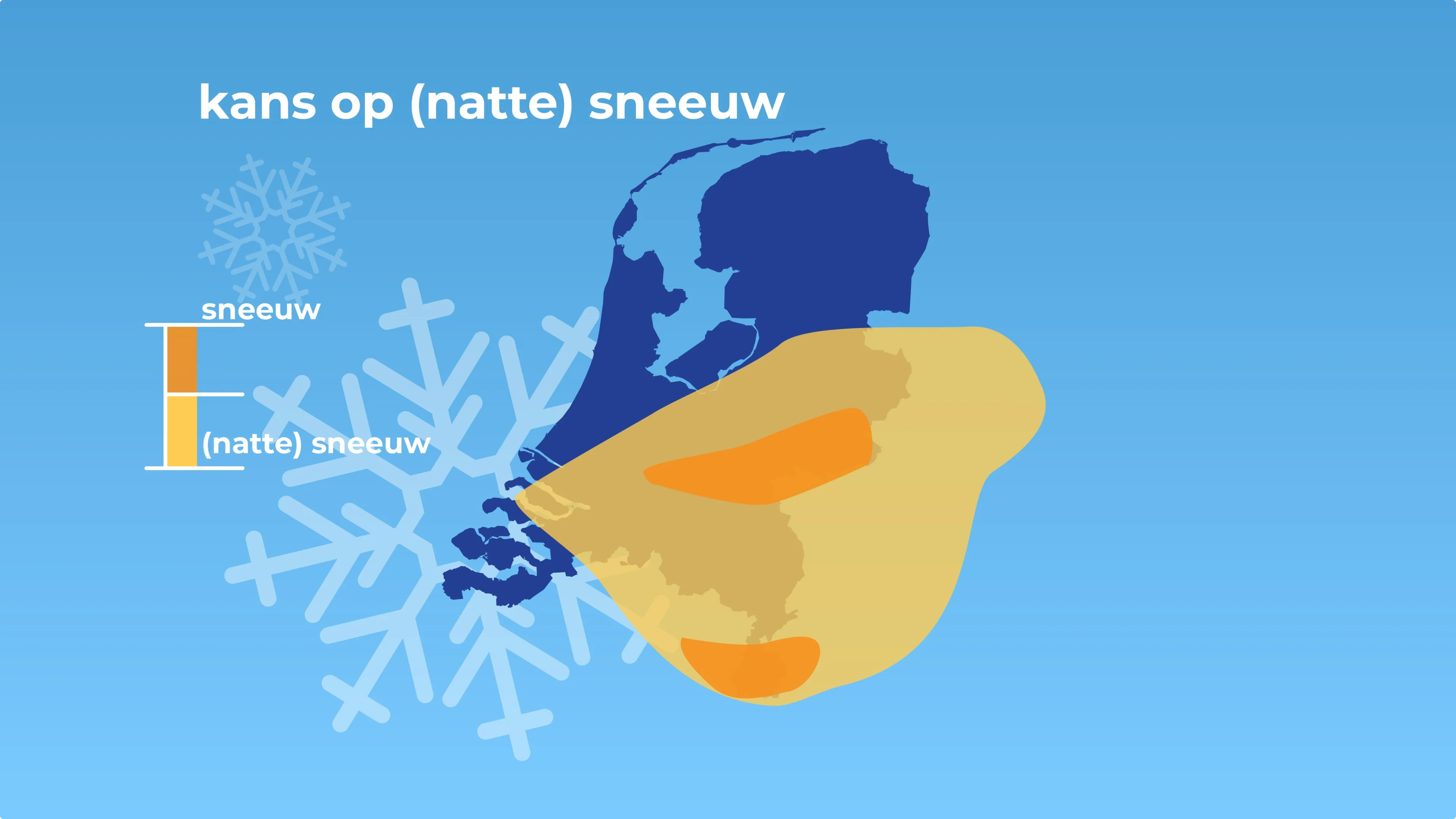 In het gele gebied kunnen wat vlokjes natte sneeuw tussen de regendruppels zitten. In de ochtend in het oosten van het land en in de namiddag en avond in het zuiden van het land. In de oranje gebieden kan het wat harder sneeuwen, maar waarschijnlijk wordt het alleen in de Limburgse heuvels een beetje wit.