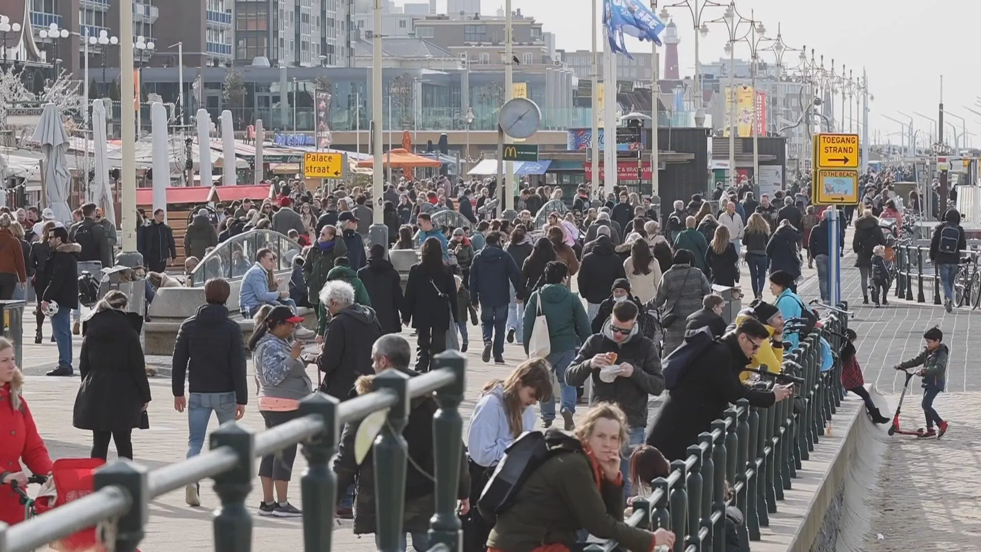 Op de boulevard van Scheveningen is het bomvol met met mensen die het eerste lentezonnetje niet willen missen. Voor ijssalons, vishandels en fastfoodketens staan rijen. Op het strand zelf valt het mee en kan goed afstand worden gehouden. Verkeersregelaars en handhavers proberen alles zo goed mogelijk in goede banen te leiden.