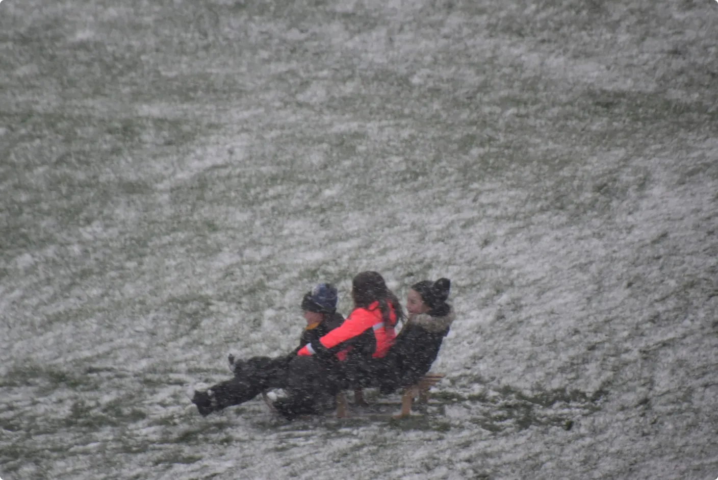 Foto gemaakt door Anne-Marie van Iersel – Vlissingen – De eerste afdaling op een slee en de eerste sneeuwpop is in de maak.