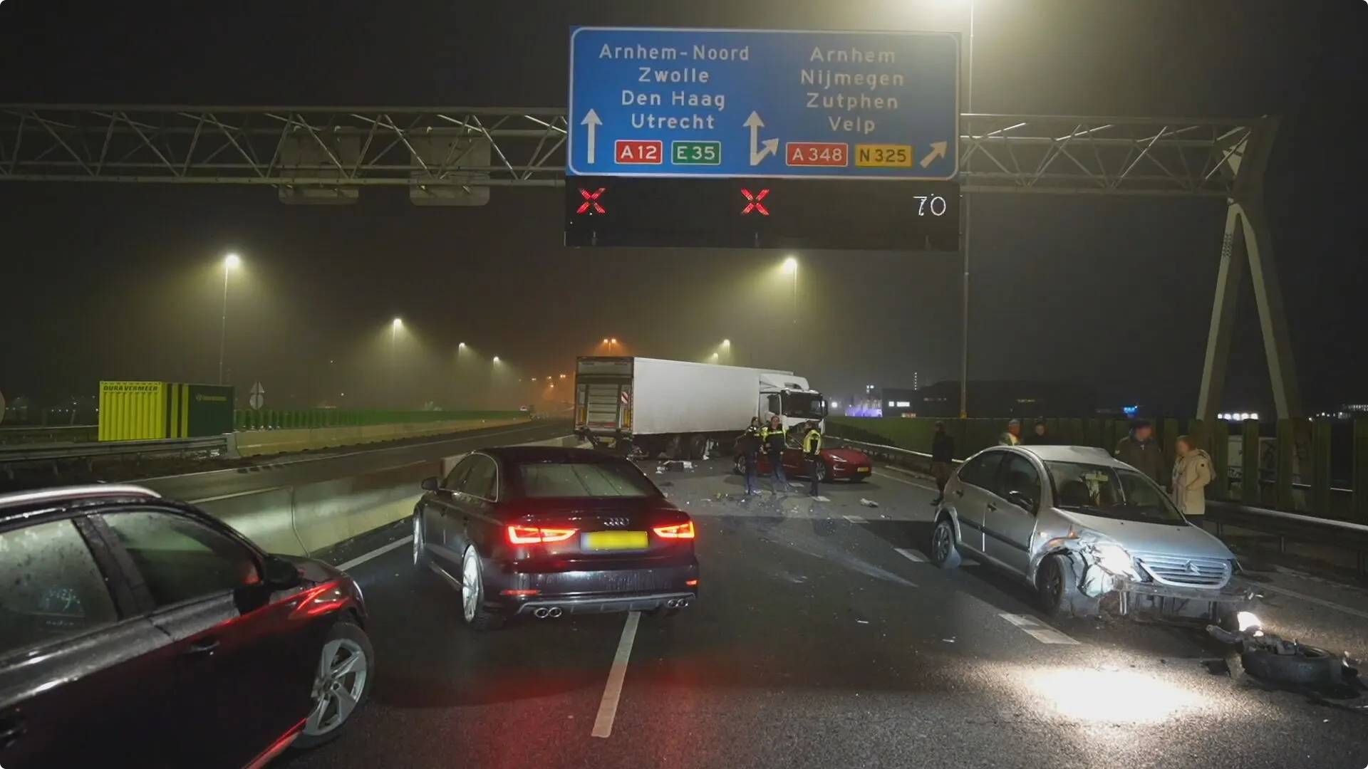 Op de IJsselbrug bij Arnhem kwamen vier auto's en een vrachtwagen met elkaar in botsing. De vrachtwagen schaarde, waardoor de snelweg A12 richting knooppunt Velperbroek ruim twee uur afgesloten was. Eén persoon raakte gewond en is per ambulance overgebracht naar het ziekenhuis. De pylonen konden rond 08.00 uur worden weggehaald, maar het duurde nog even voor de vertraging afnam. Ook op de omliggende wegen liep het vast.