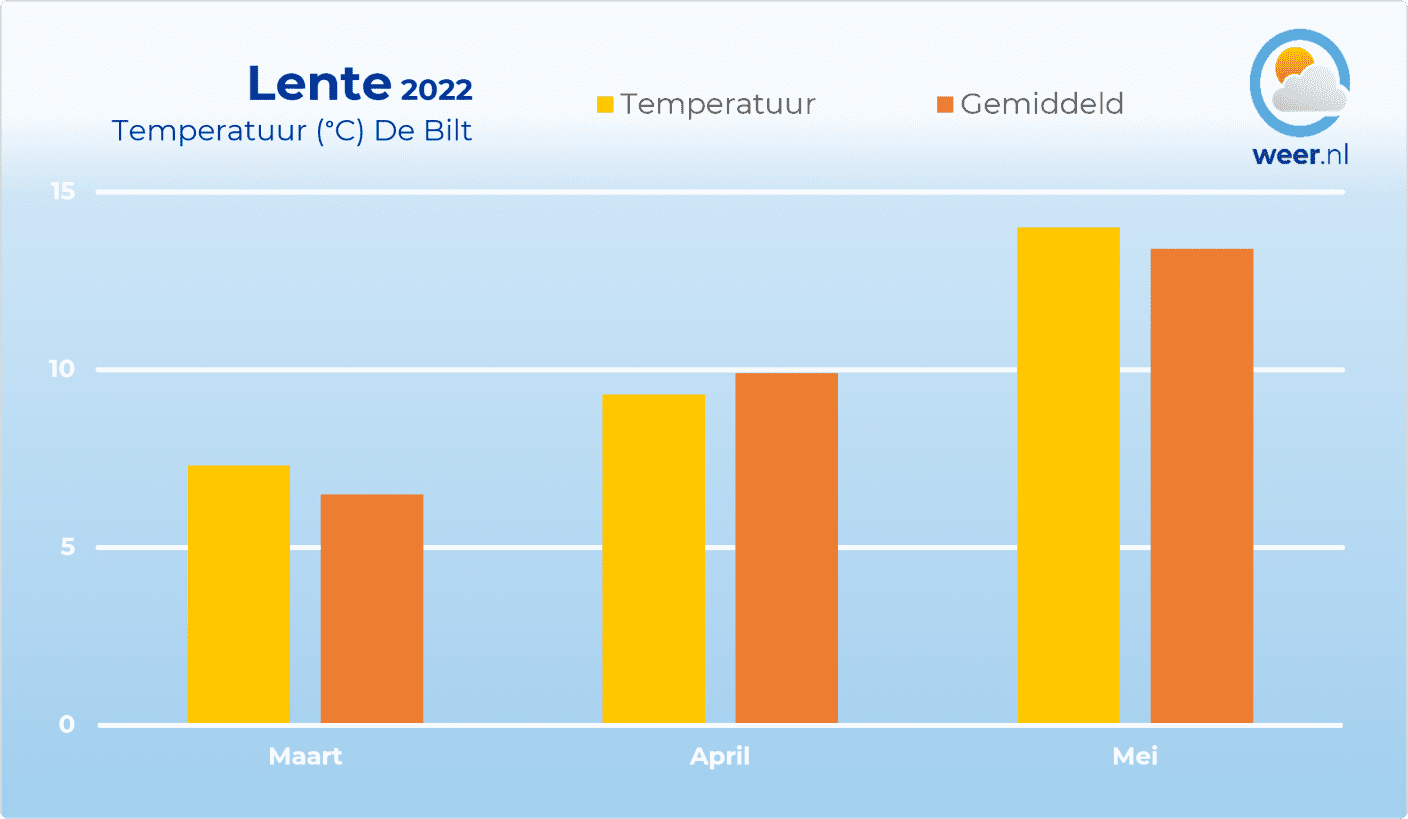 Tussen 1 maart en 31 mei was het dus gemiddeld 10,2 graden en dat is een fractie warmer dan in het huidige klimaat (9,9 graden). Dat hebben we vooral te danken aan de maanden april en mei, toen het zachter was dan normaal. In april bleef de temperatuur juist wat achter in vergelijking met het langjarige gemiddelde.