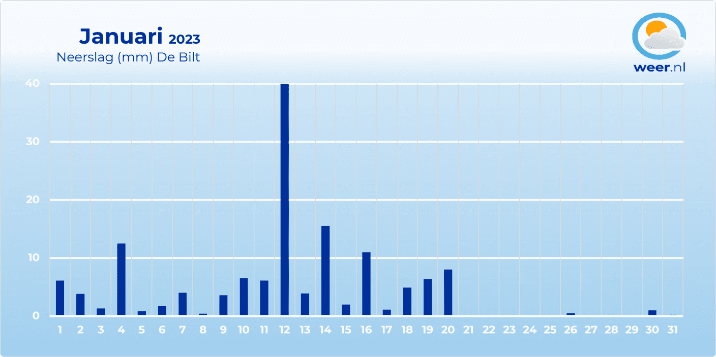 Januari 2023 is tot nu toe veruit de natste januari ooit gemeten. Gemiddeld viel er deze maand meer dan 140 mm regen in de Bilt. Normaal valt er gemiddeld in januari ongeveer 70 mm regen per maand. Er is een duidelijke trend te zien in het winterklimaat. De maand januari wordt net als de andere wintermaanden snel zachter en natter.